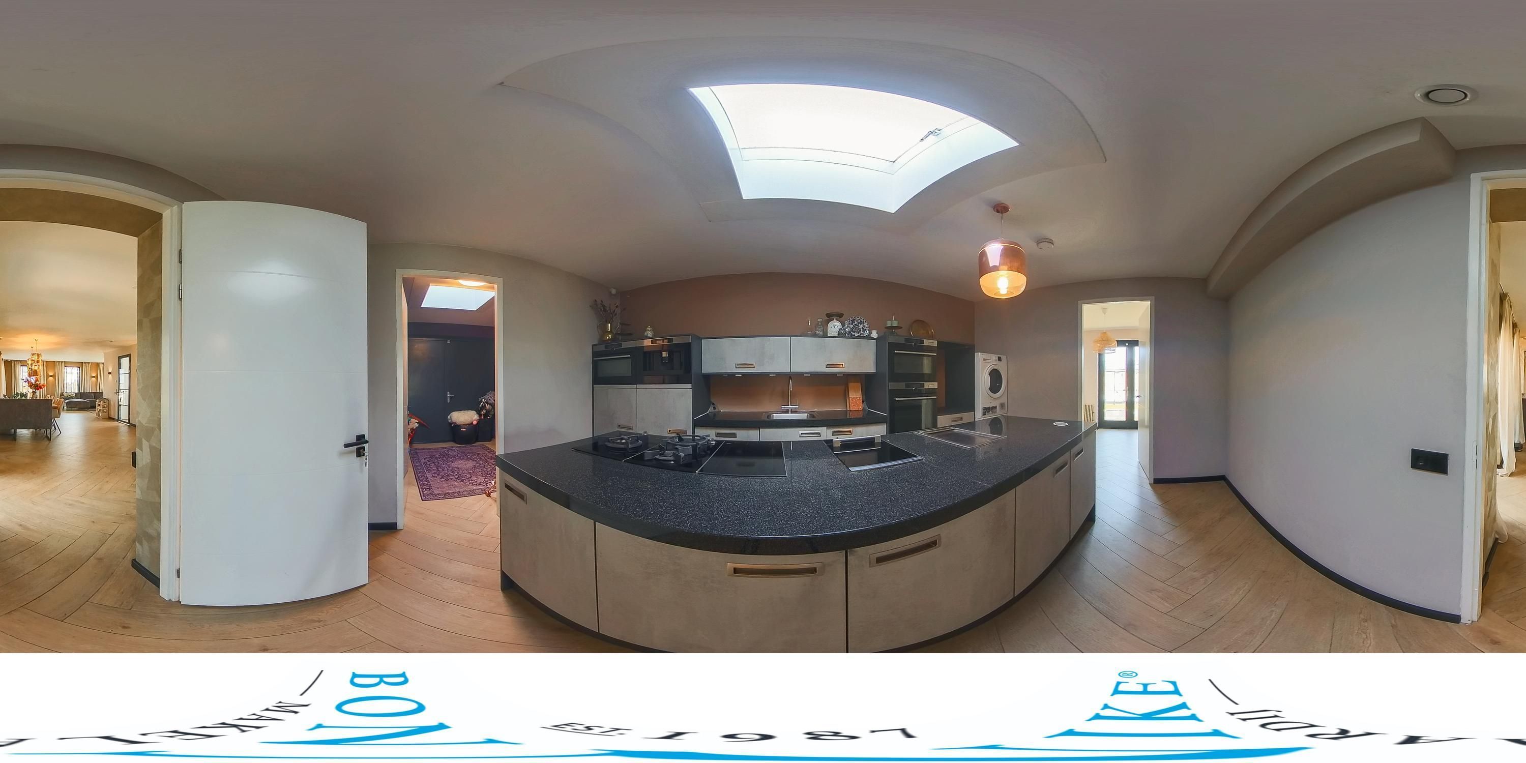 Aangrenzend bevindt zich de bijkeuken, extra licht dankzij een lichtkoepel en voorzien van een tweede keukenopstelling, aansluitingen voor wasapparatuur en veel bergruimte. Aan weerszijden van de bijkeuken bevinden zich twee multifunctionele ruimtes: