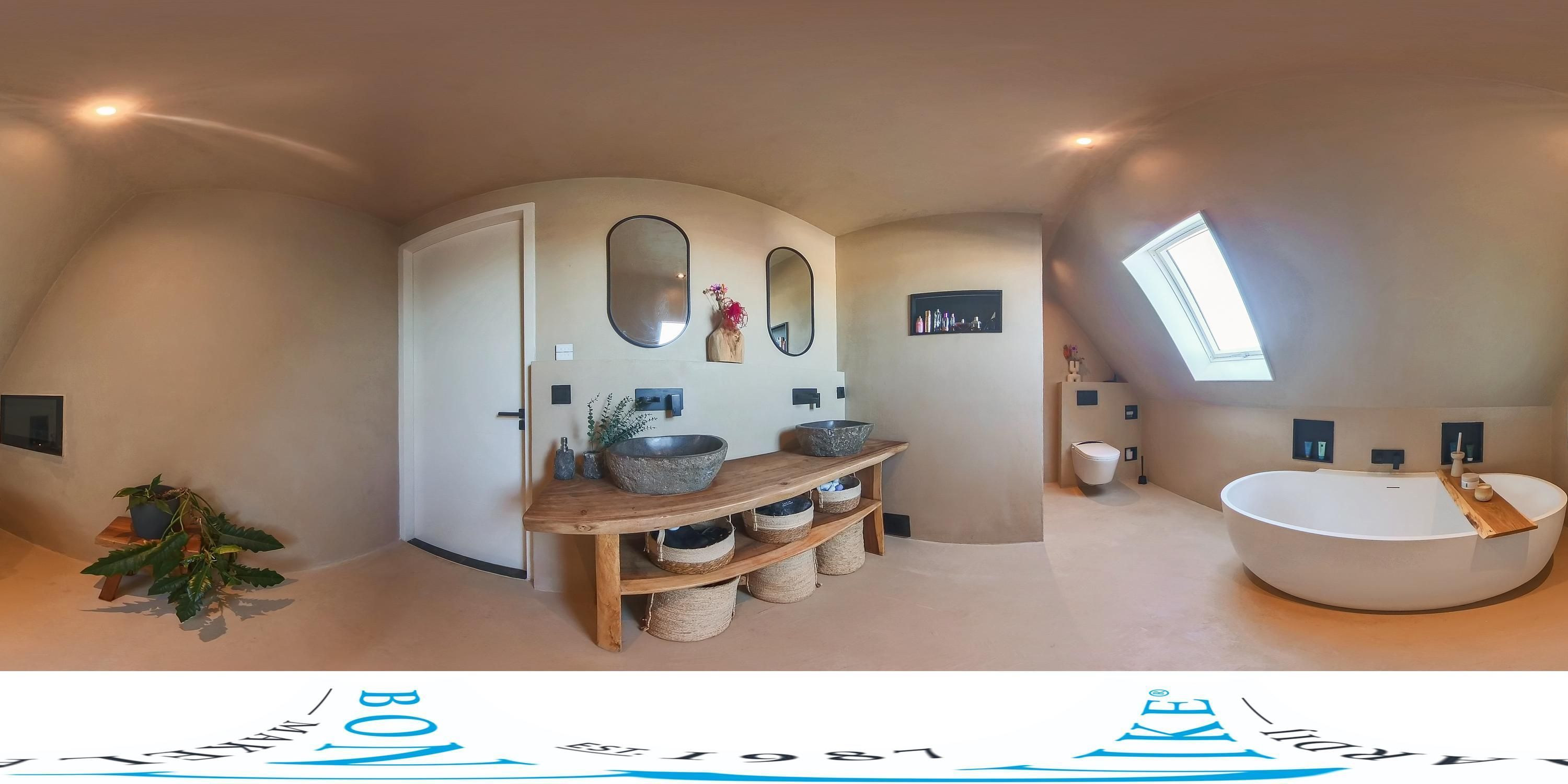 Centraal op de verdieping bevindt zich de riante en luxe uitgevoerde badkamer, welke met recht een wellnessruimte genoemd mag worden. De badkamer is voorzien van een ligbad met geïntegreerde tv, een stijlvol dubbel wastafelmeubel met waskommen, een royale inloopdouche met dubbele regendouches en sunshower, en een modern toilet met spoelfunctie. Het aanwezige dakraam zorgt voor een prettige lichtinval en natuurlijke ventilatie.