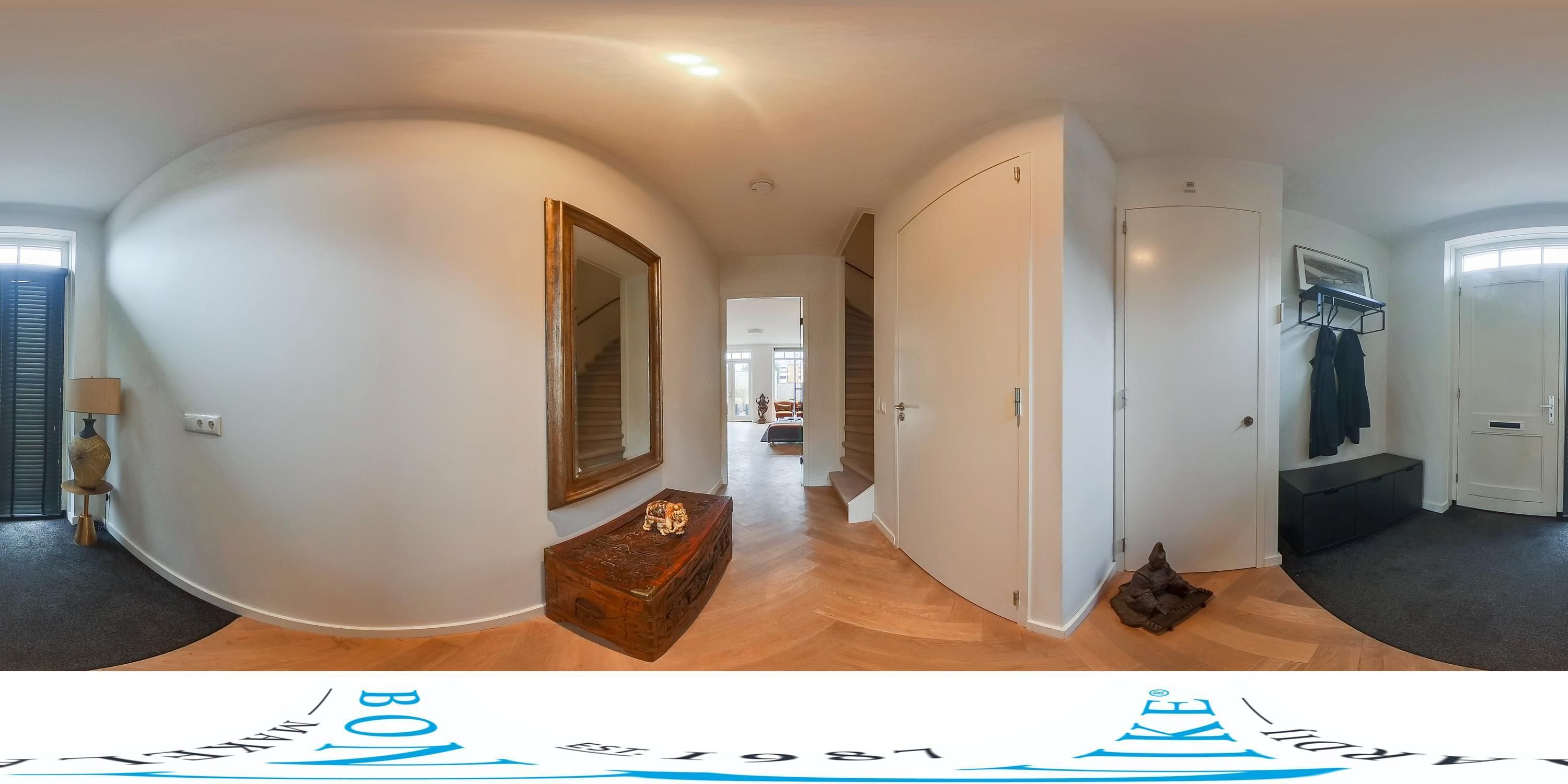 De gehele begane grond is afgewerkt met glad stucwerk (wanden en plafonds) en voorzien van vloerverwarming in combinatie met een visgraat lamelparketvloer.