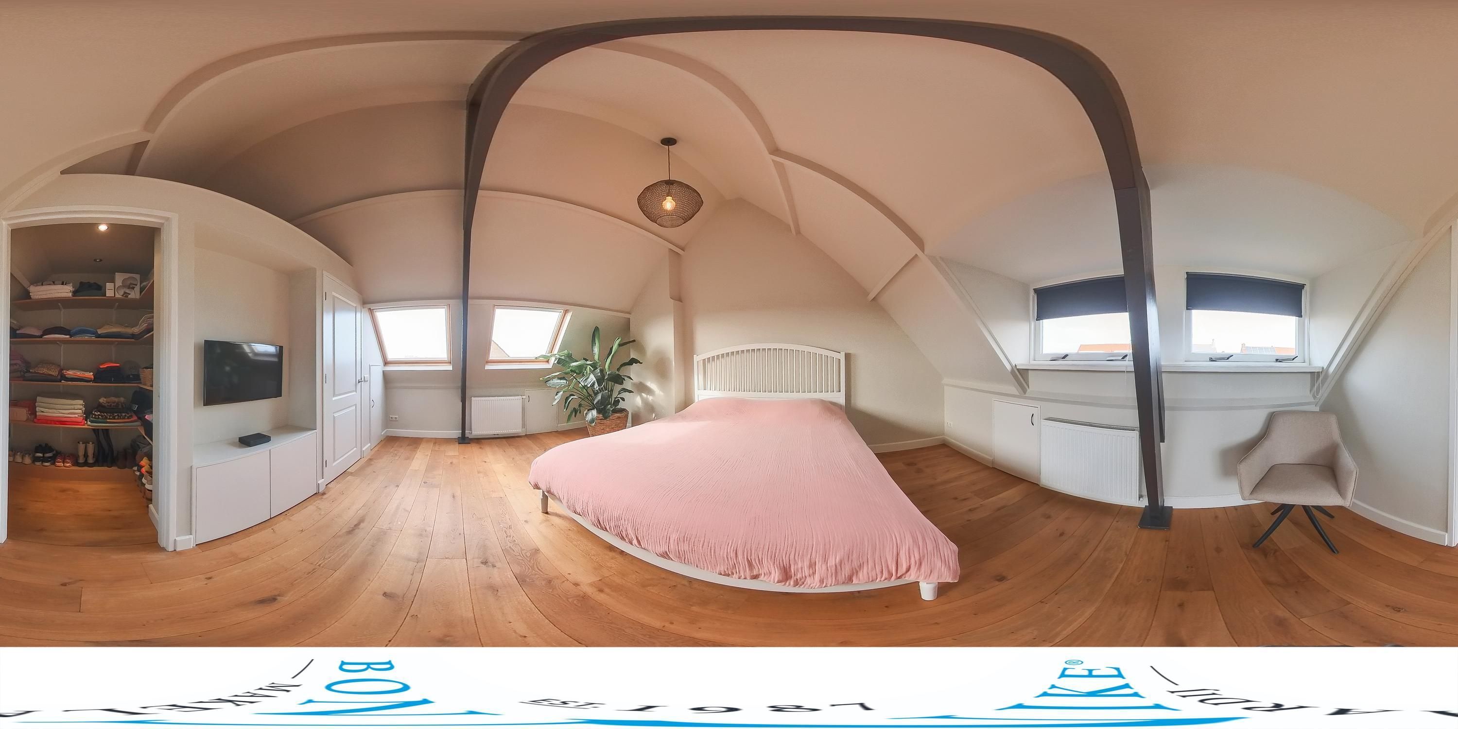 Via de vaste trap bereikt u de geïsoleerde tweede verdieping. De ruime slaapkamer met walk-in-closet beschikt over veel daglicht door het dakkapel en de velux dakramen. Achter de knieschotten is er veel bergruimte aanwezig en tevens ook de cv-installatie. Doordat deze slaapkamer tot de nok open is geeft dit een fraai ruimtelijk effect.