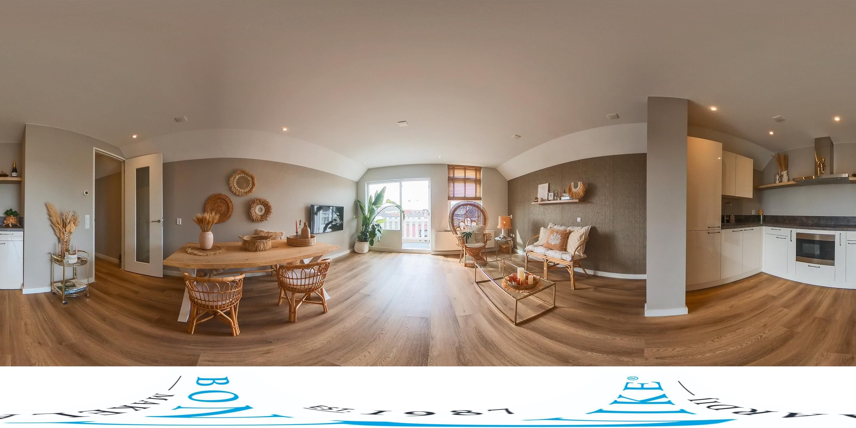 De lichte woonkamer bevindt zich aan de voorzijde van het appartement en wordt gekenmerkt door de grote raampartijen, waardoor er veel natuurlijk daglicht binnenvalt. Er is voldoende ruimte voor zowel een comfortabele zithoek als een gezellige eethoek.