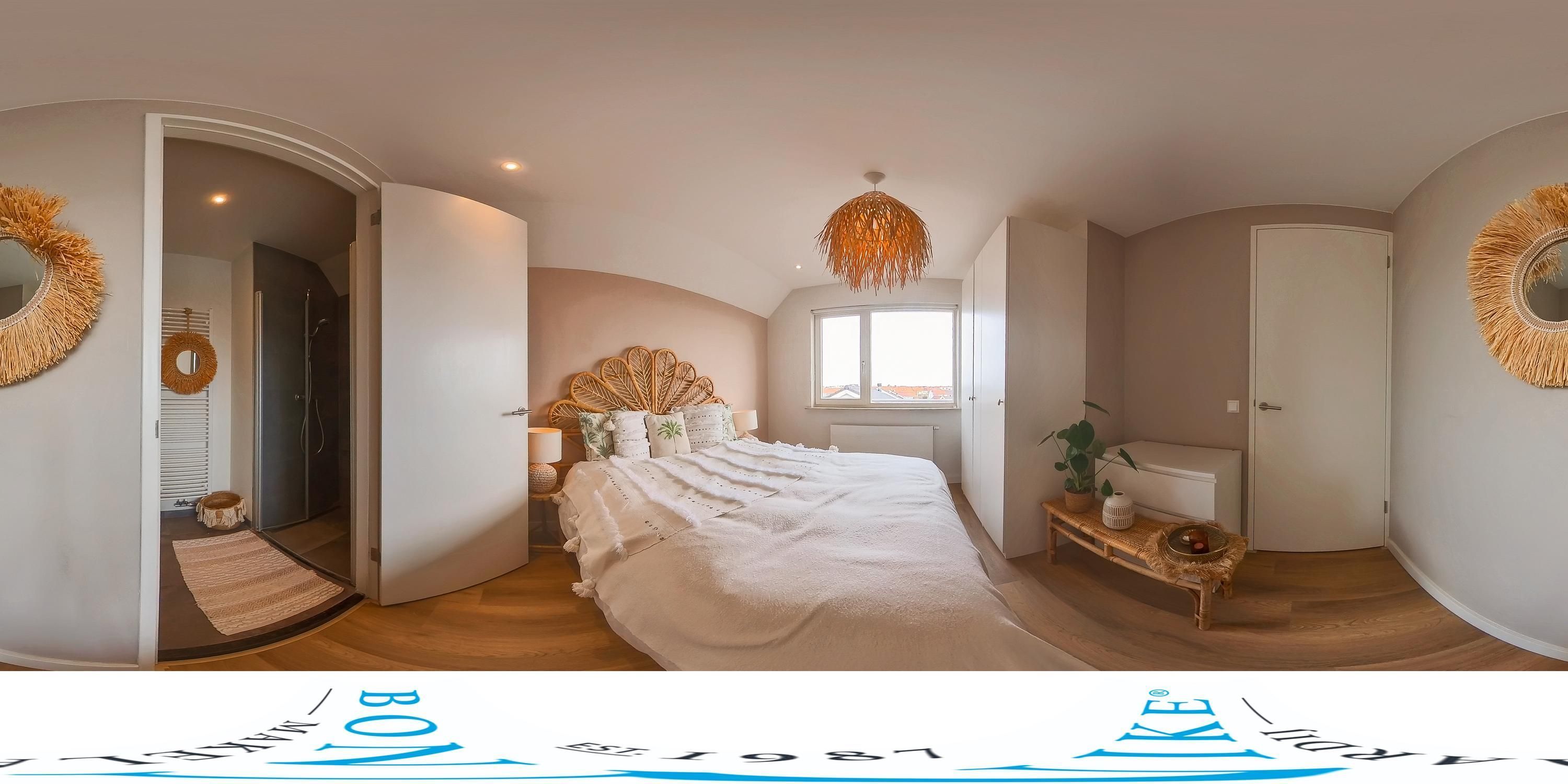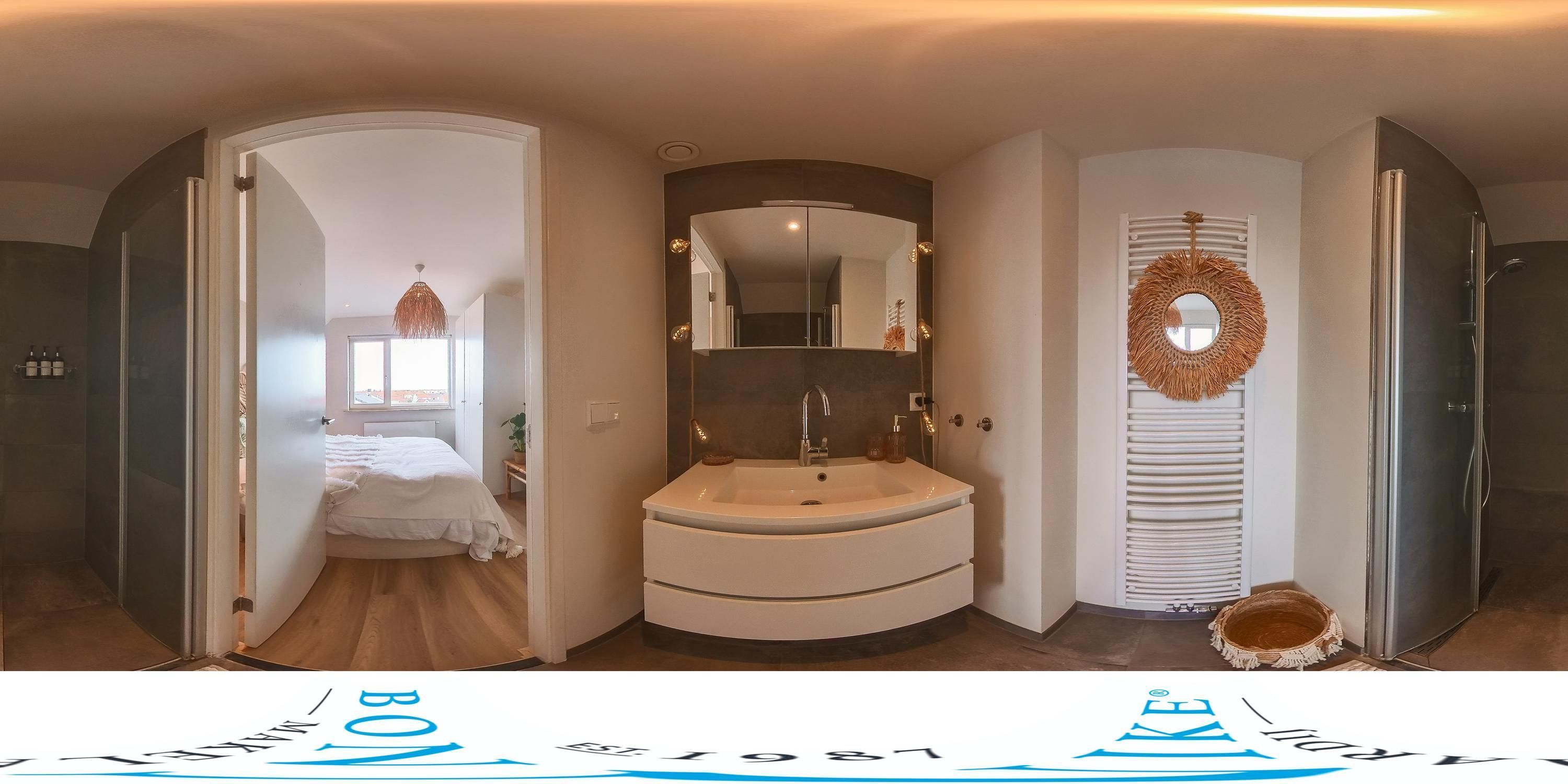 De aangrenzende badkamer is modern en strak afgewerkt en beschikt over een inloopdouche en een stijlvol wastafelmeubel met opbergruimte en spiegelkast. Dankzij de verzorgde afwerking heeft de badkamer een frisse en eigentijdse uitstraling.
