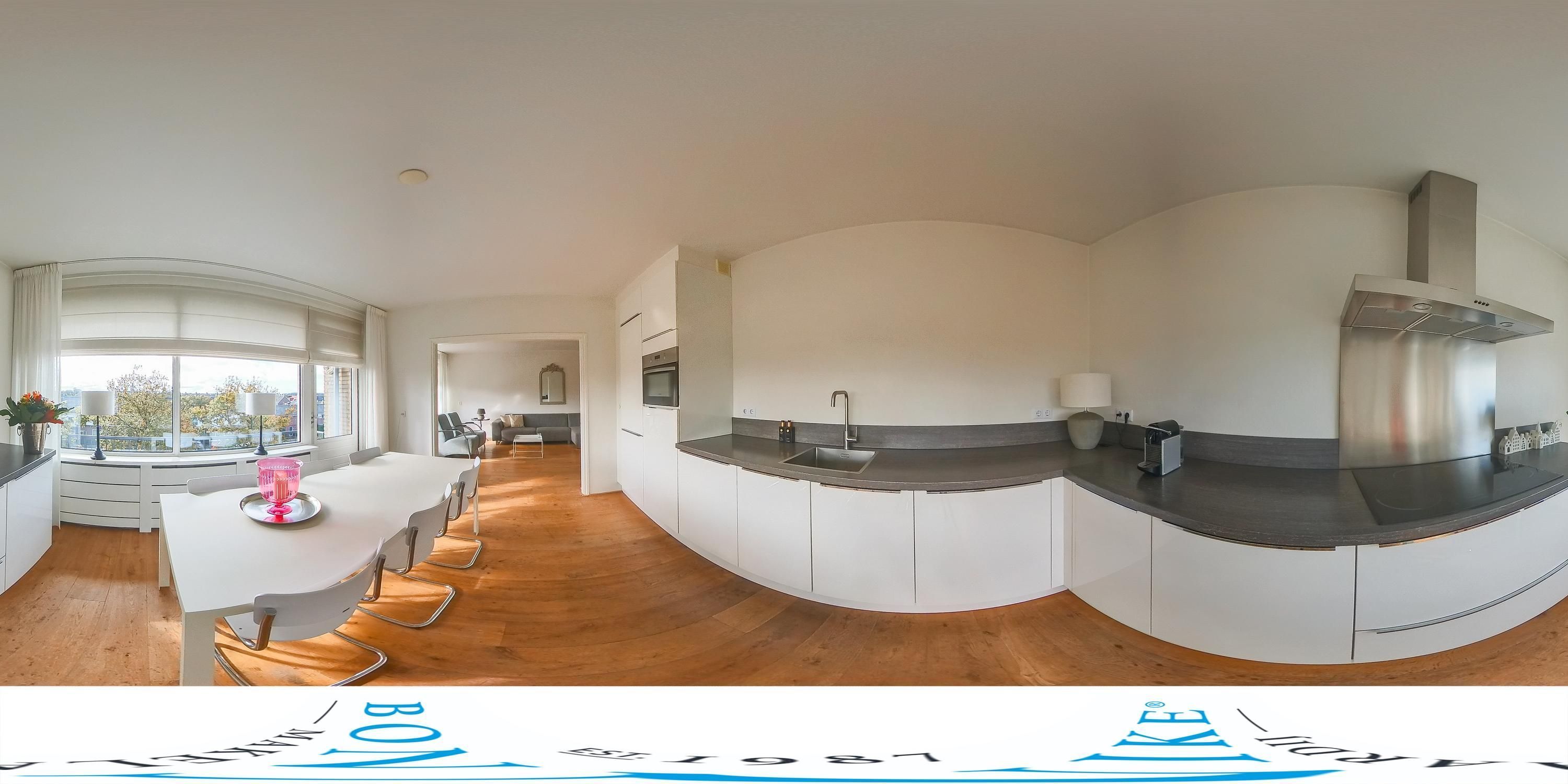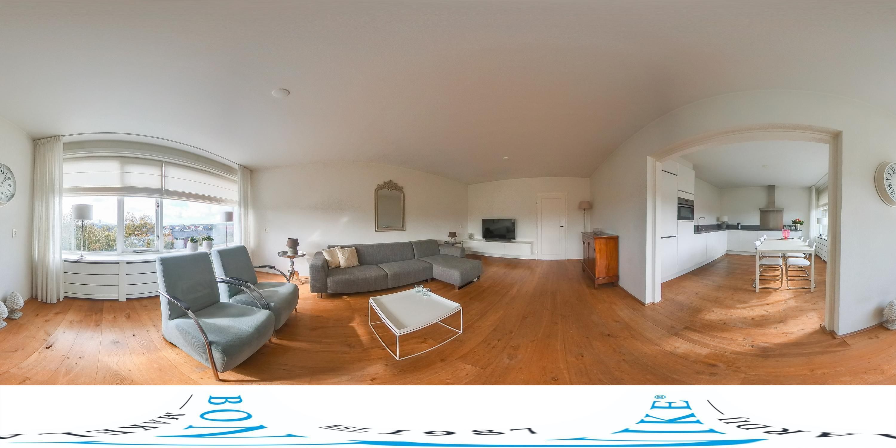 De woonkamer met aansluitend de open woonkeuken is ruim en licht dankzij de grote raampartijen en de verzorgde afwerking. De massief houten vloer, luxe binnendeuren, strak gestucte wanden en plafonds geven het appartement een aangename, stijlvolle sfeer.