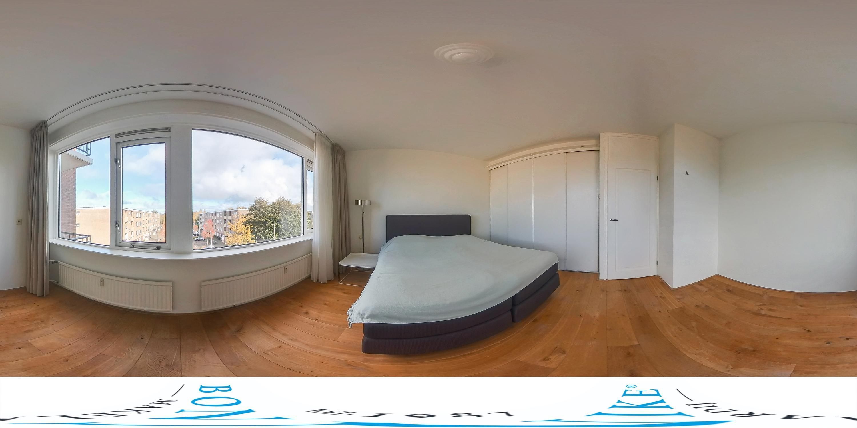 De ruime hoofdslaapkamer (voorheen 2 slaapkamers) ligt aan de rustige achterzijde van het appartement en biedt volop ruimte voor een groot bed en extra meubilair. De kamer is voorzien van vaste inbouwkasten en biedt daardoor veel praktische opbergruimte. Dankzij de grote raampartij valt er veel natuurlijk licht binnen, wat bijdraagt aan het comfortabele gevoel.