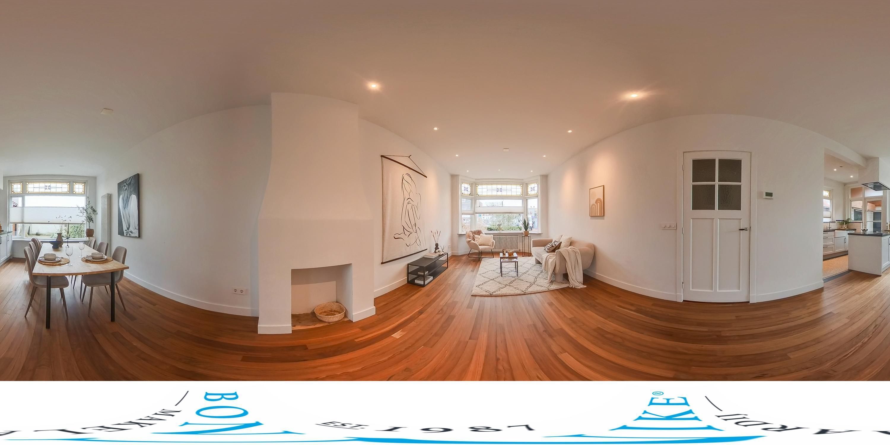 Via de deur rechts betreed je de woonkamer, die dankzij de hoge plafonds, inbouwspots en grote raampartijen bijzonder licht is. De houten vloer en glad gestucte wanden vormen een prachtig contrast met de authentieke glas-in-loodramen. Aan de voorzijde bevindt zich een erker die extra sfeer en licht toevoegt.