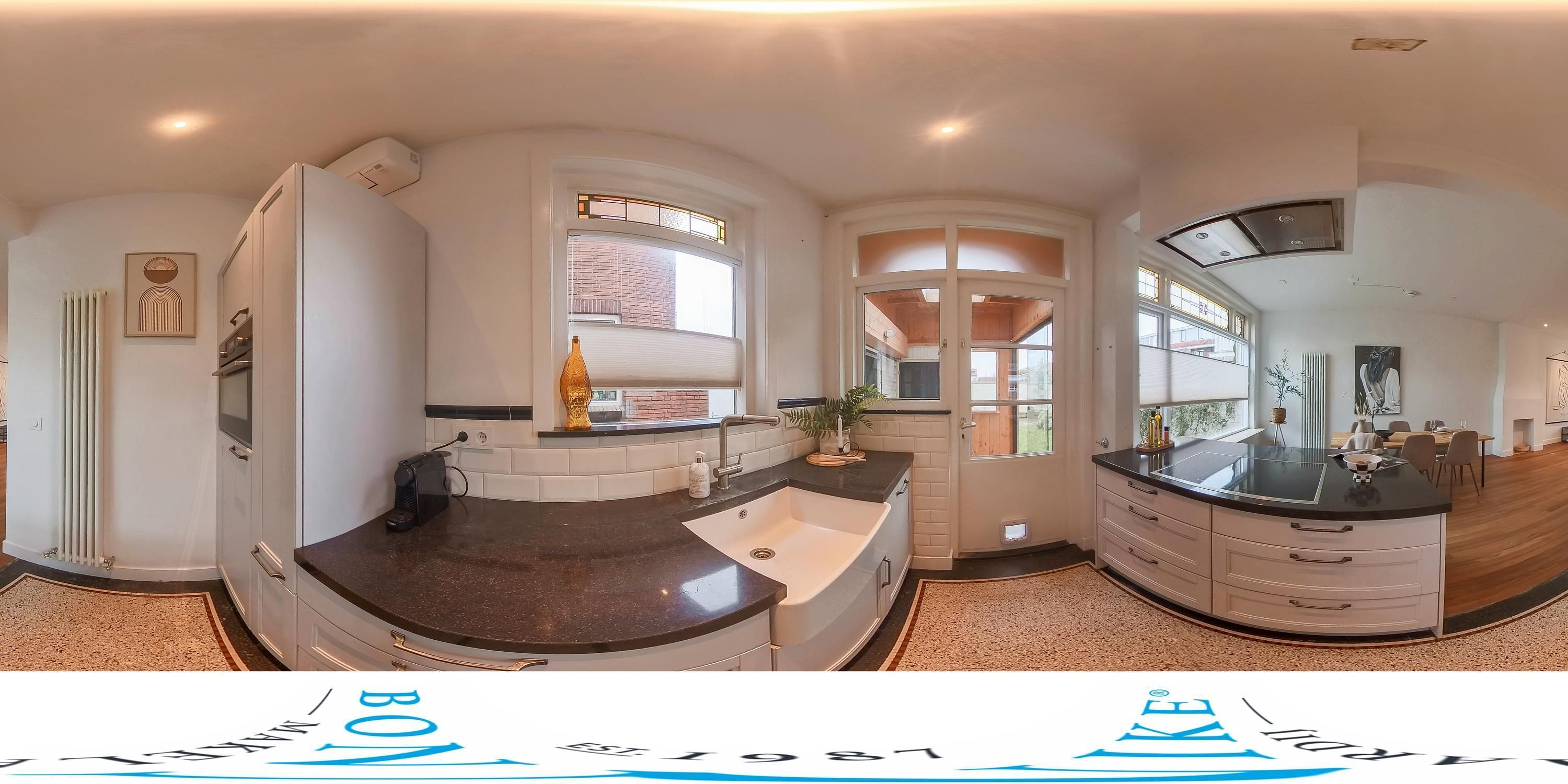 De keuken is stijlvol en functioneel, voorzien van een inductiekookplaat, combi-magnetron, koelkast, rvs-afzuigschouw en inbouwspots. Een airco zorgt voor aangename temperaturen, en het zijraam met glas-in-lood zorgt voor extra daglicht. Vanuit de keuken is er via een deur toegang tot de overkapping, die op haar beurt zowel naar de tuin als naar het zijpad aan de zijkant van de woning leidt. Zo is de overkapping op twee manieren te betreden: direct vanuit de keuken of via het zijpad. Vanuit de overkapping is er ook toegang tot een van de bergingen.