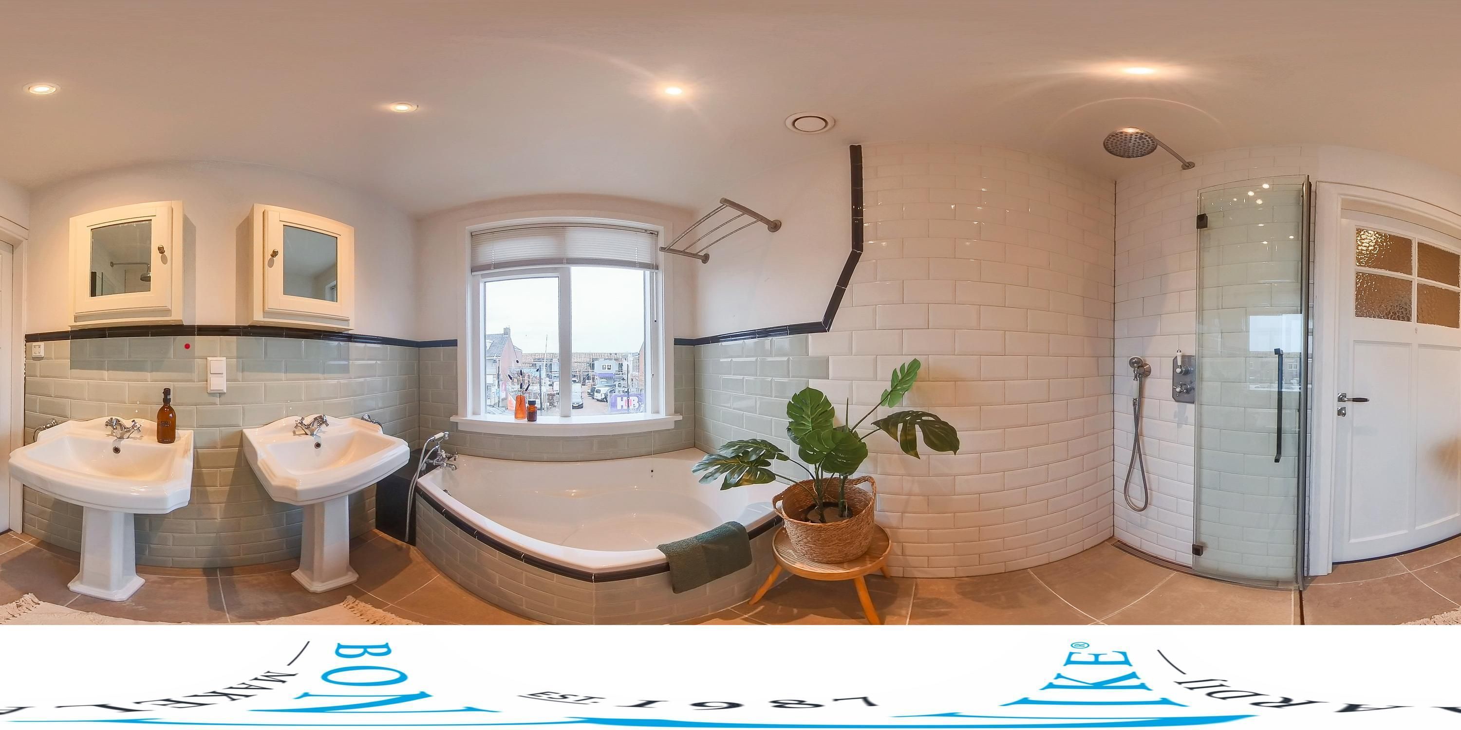 De badkamer is elegant vormgegeven met behoud van het karakter van de woning en beschikt over een inloopdouche, ligbad, dubbele wastafel en inbouwspots.